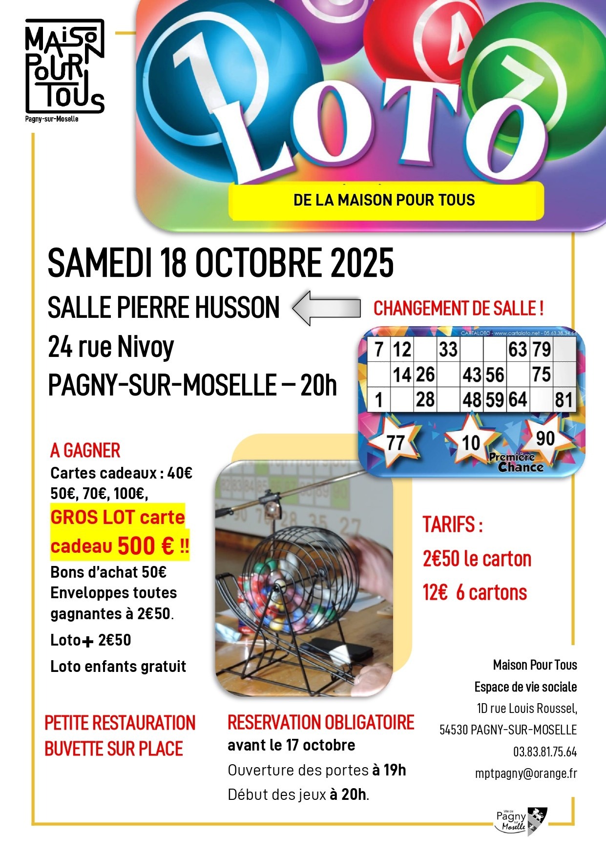 Loto de la Maison Pour Tous de Pagny-sur-Moselle, samedi 18 octobre à la Salle Pierre Husson