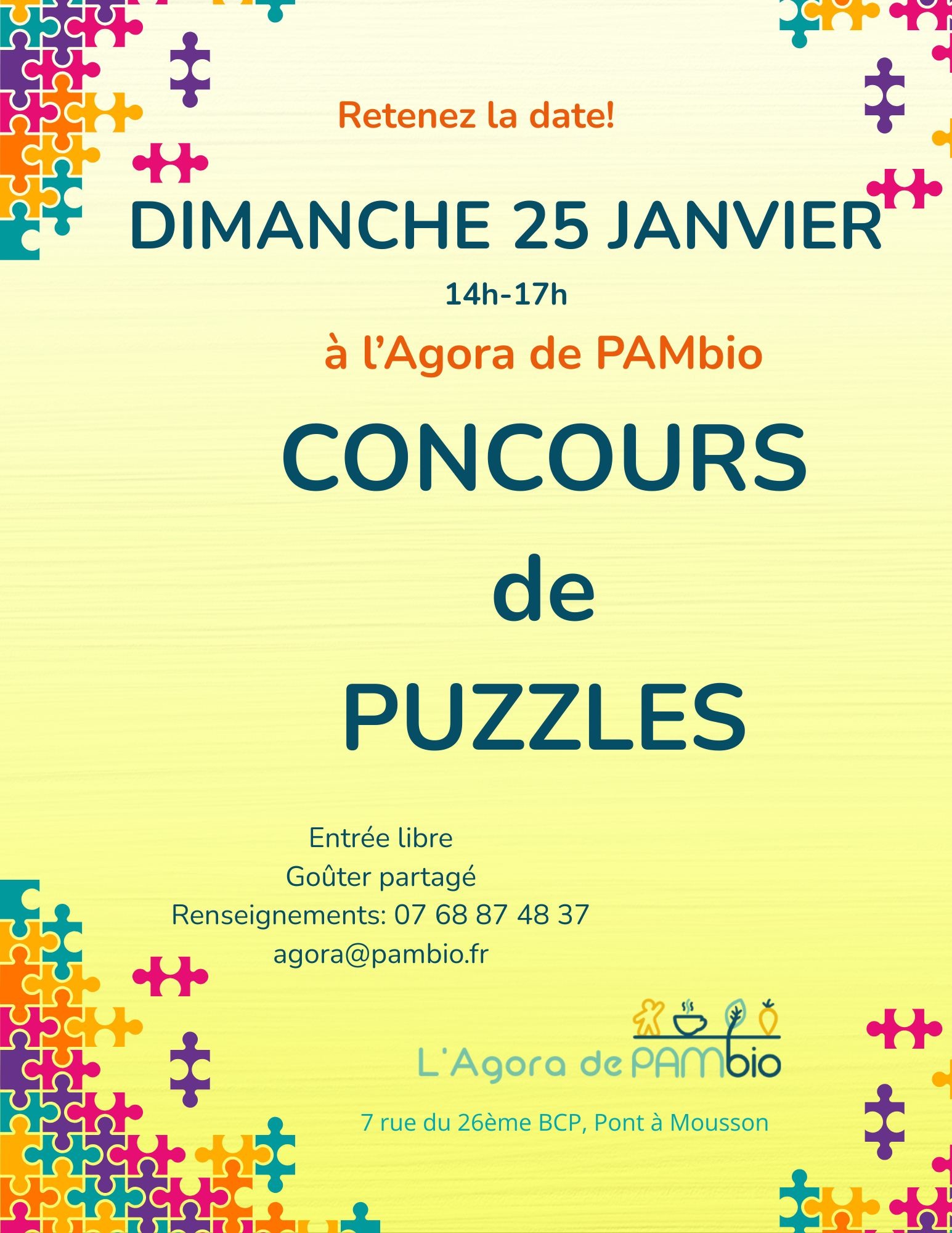 Les portes de l'Agora s'ouvrent dès 14h à tous les amateurs : des équipes, des puzzles 1500 pièces, qui finira en premier ? Des lots, un goûter partagé, tous les ingrédients pour un chaleureux après-midi hivernal !
