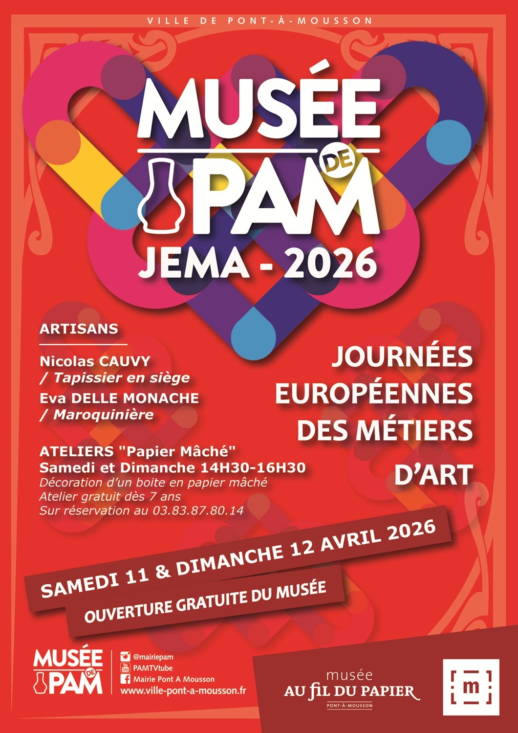 Dans le cadre des Journées Européennes des Métiers d'Art 2026, le musée municipal « Au fil du Papier » de Pont-à-Mousson ouvrira ses portes gratuitement au public le samedi 11 et dimanche 12 avril, de 14h à 18h.